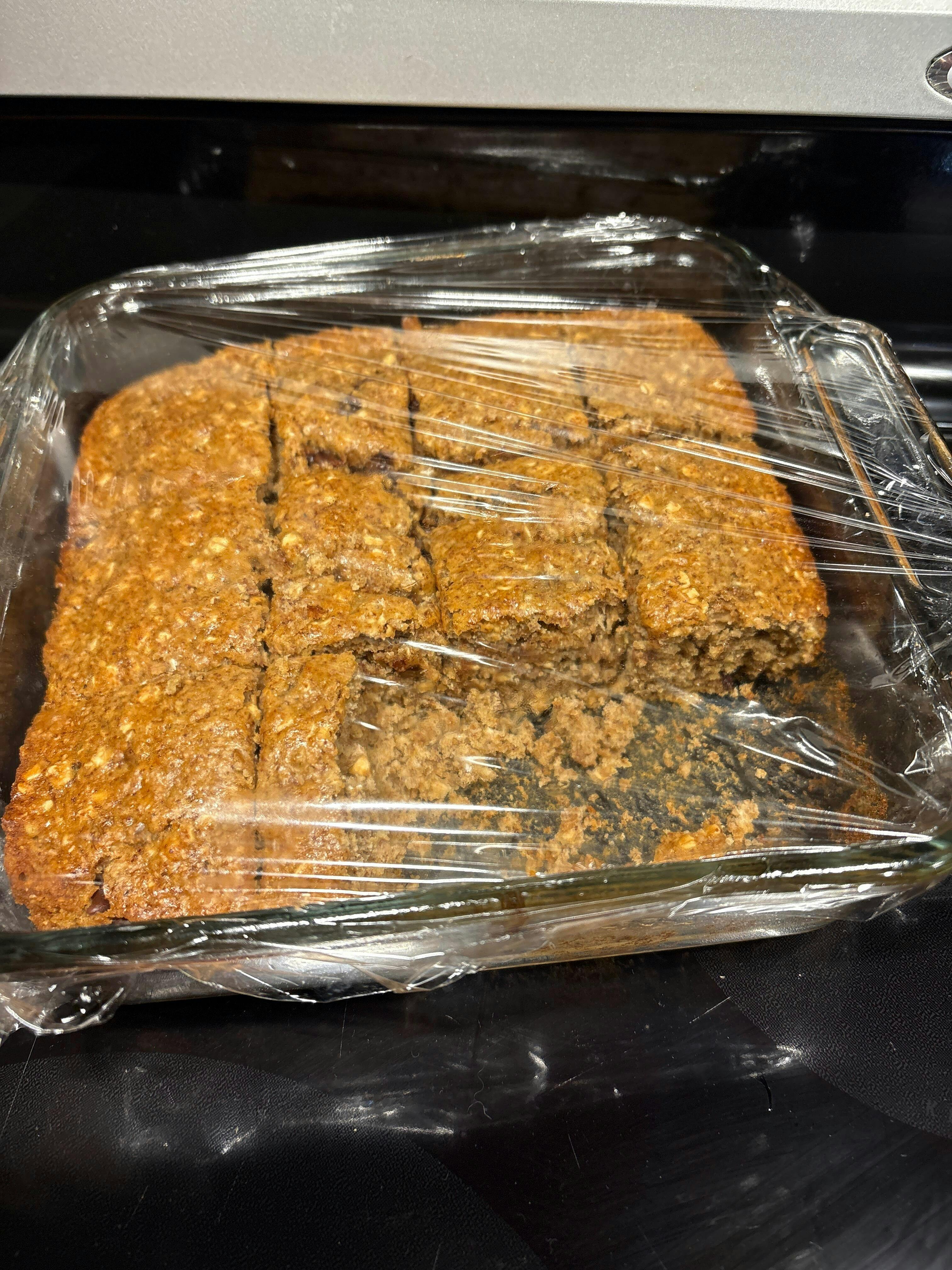 Farine de blé, Dattes en poudre biologiques, Flocons d’avoine, Chocolat noir végane (sucre, chocolat non sucré, beurre de cacao, léthicine de soya, arôme naturel), Son de blé, Poudre à pâte, Bicarbonate de sodium, Arôme naturel de banane, Sel.